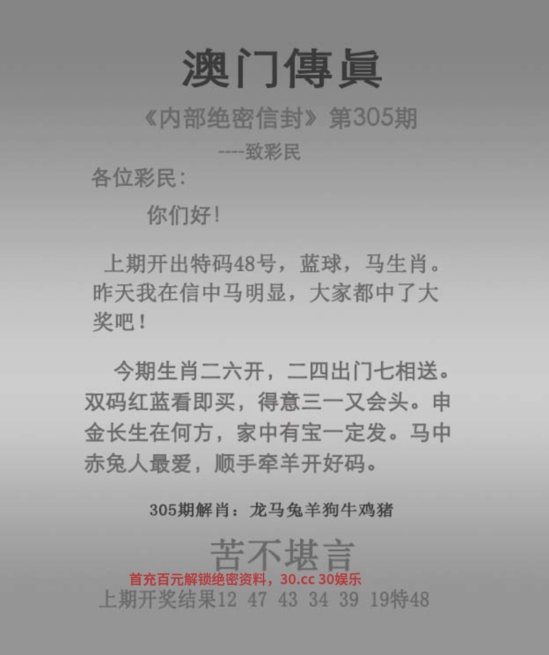 | 305期精解传真: 今期生肖二六开,二四出门七相送。 双码红蓝看即买,得意三一又会头。 申金长生在何方,家中有宝一定发。 马中赤兔人最爱,顺手牵羊开好码。 苦不堪言 解:今期双码红蓝看即买,解双肖虎鼠狗猴马龙,家中有宝一定发,解家禽生肖牛猪鸡羊狗马。 综合:羊牛兔马鸡狗猴虎鼠 |