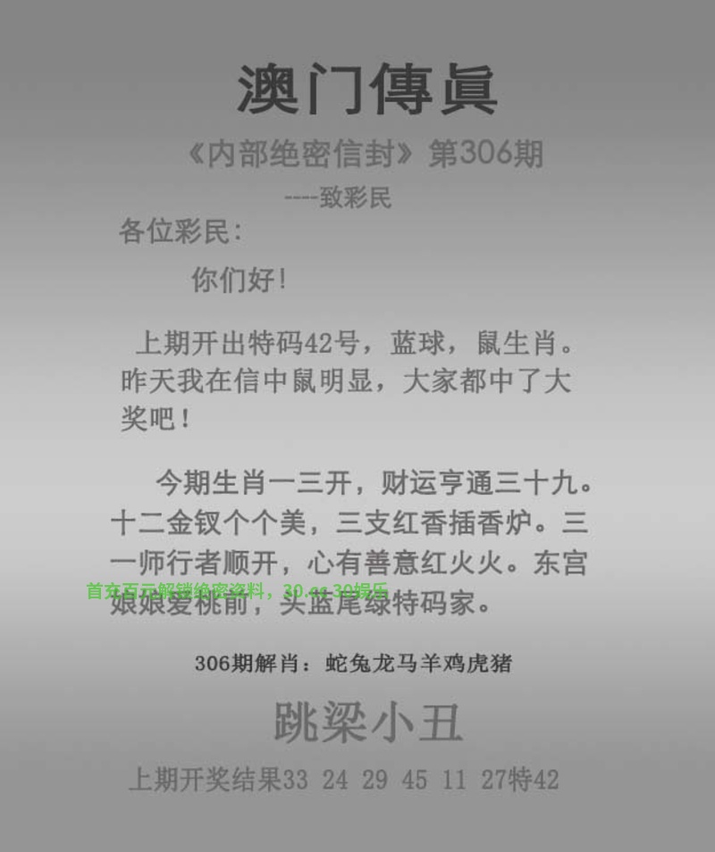 | 306期精解传真: 今期生肖一三开,财运亨通三十九。 十二金钗个个美,三支红香插香炉。 三一师行者顺开,心有善意红火火。 东宫娘娘爱桃前,头蓝尾绿特码家。 跳梁小丑 解:今期生肖一三开,解单肖兔牛猪鸡羊蛇,东宫娘娘爱桃前,解女肖兔蛇羊鸡猪。 综合:猴猪虎蛇鸡牛马鼠羊 主特:10.07.16.13.09.17.36.30.11 |
